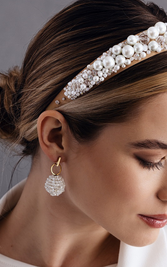 Niezwykłe kolczyki w kształcie kuli. Wyplatane ręcznie drobnymi perłami i szklanymi kryształkami.